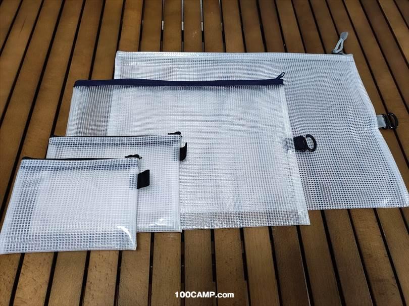 100円ショップ・ダイソーの『ビニールネットケース』を使えばいろいろなサイズのキャンプ道具を収納できます。